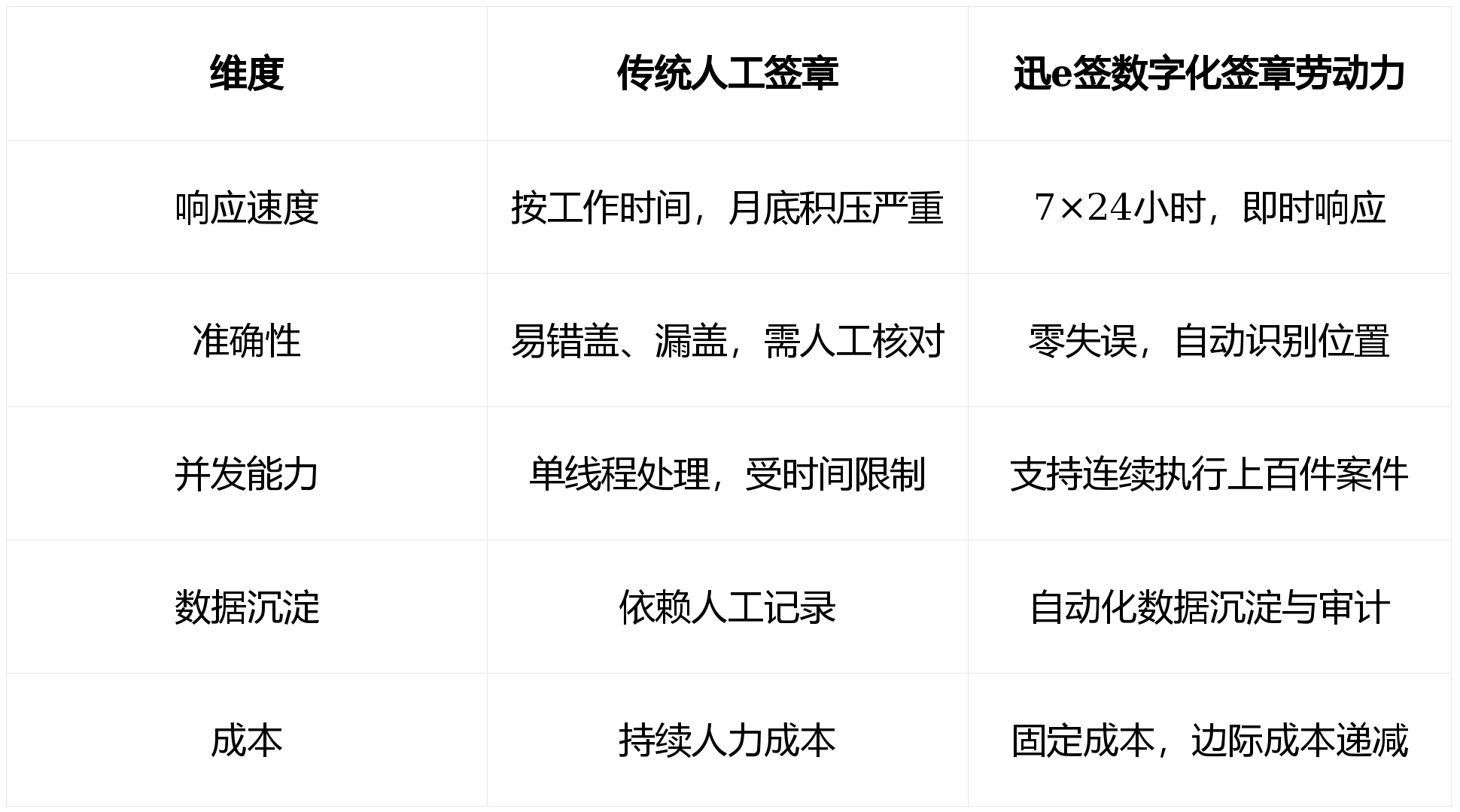 A:迅e签·辅帮签章正在用户界面运转,不会侵入法院系统底层,所有操做都有完整的审计日记记实,平安性远超保守人工操做,符院消息化扶植平安规范。