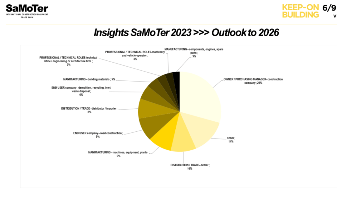汇聚了全球顶尖品牌阵容 ——6-12 号馆及多个展区内,三一沉工、徐工、卡特彼勒、沃尔沃、日立、小松等 20 余家出名企业携全品类设备参展,从挖掘机、起沉机到混凝土机械、矿山设备全笼盖,更凭仗精准的不雅众形成凸显商贸价值:29% 的建建公司业从 / 采购司理、18% 的分销商业群体(含 10% 经销商取 8% 分销商 / 进口商)及 9% 的道扶植终端用户等专业群体齐聚,能高效对接采购、合做需求。