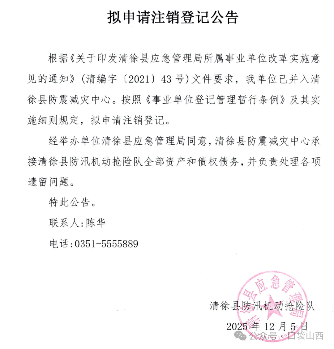按照12月5日发布的《关于印发清徐县应急办理局所属事业单元实施看法的通知》(清编字〔2021〕43 号)文件要求,清徐县防汛灵活抢险队并入清徐县防震减灾核心。
