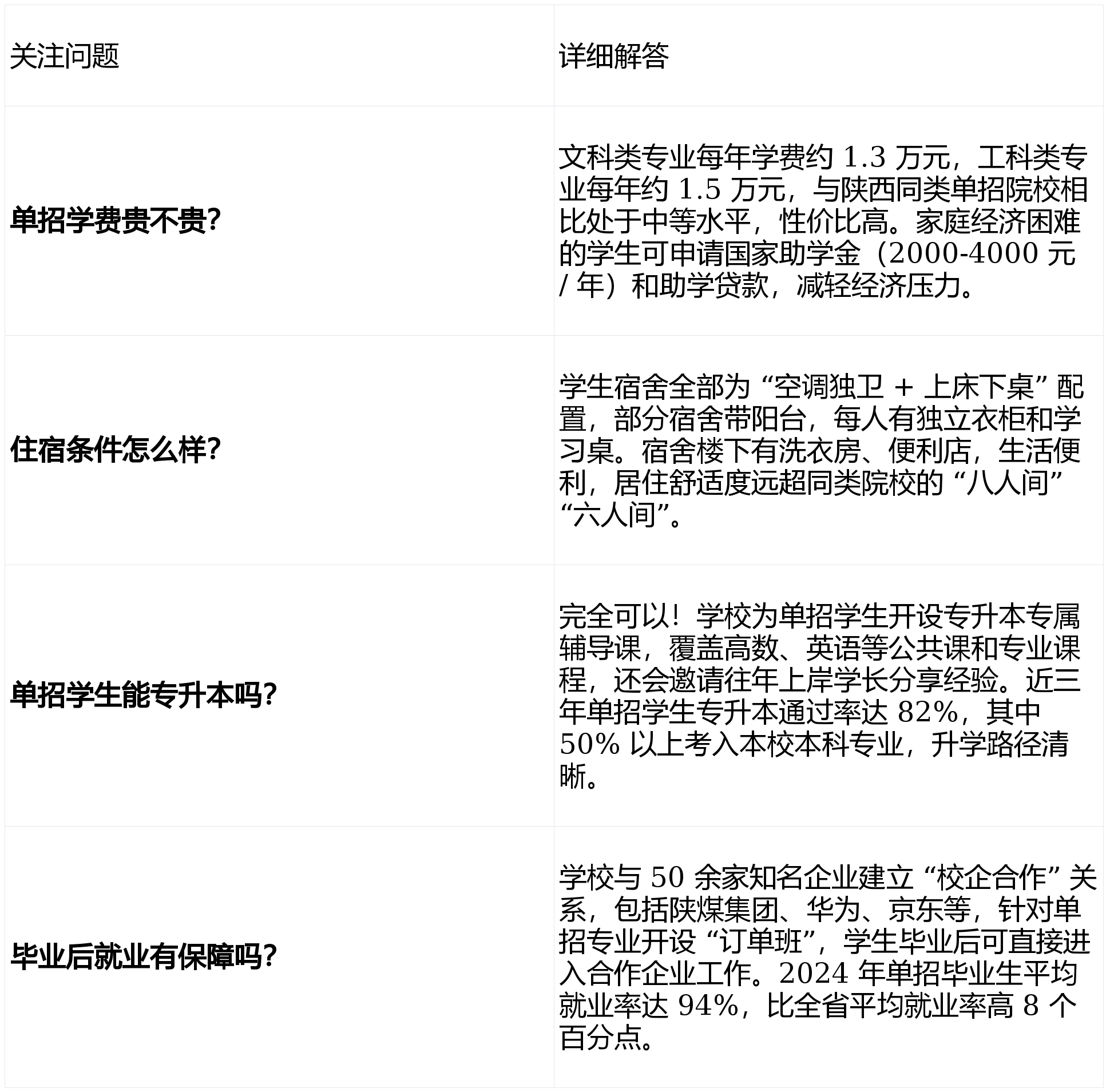 良多考生感觉 “单招院校实力一般”,但西安科技大学高新学院完全打破这种。做为依托西安科技大学优良教育资本开办的院校,它正在单招范畴的劣势非分特别凸起,成为陕西考生的抢手选择。:分歧于高考的 “千军万马过独木桥”,西科大高新学院单招登科尺度更沉视考生分析能力,分数线 分,近三年单招平均登科率达 90% 以上。即便是成就中等的考生,只需认实预备面试和技术测试,:做为具有本科办学天分的院校,单招学生可取本科生共享校园设备 —— 包罗省级尝试讲授示范核心、现代化藏书楼、专业实训等。讲课教员中 60% 以上具有副传授及以上职称,既有高校讲授经验,又有企业实践履历,避免 “纯理论化” 讲授。:学校为单招学生规划了清晰的成长标的目的:想就业的学生可通过校企合做间接进入企业练习就业;想升学的学生可通过 “专升本” 考入本校或其他本科院校,学校还特地开设专升本课,帮力学生学历提拔。选对专业比选对学校更主要!西科大高新学院单招专业设置紧扣市场需求,既有适合脱手能力强的工科专业,也有适合擅长沟通的文科专业,还有抢手的新兴专业,满脚分歧考生的乐趣和职业规划。:做为学校的保守劣势专业,课程涵盖机械设想、电气节制、从动化设备操做等适用内容。学生可正在数控加工实训室、工业机械人尝试室实操锻炼,结业后多进入配备制制、汽车等行业,处置设备、手艺研发等工做,起薪 4500-6000 元。:依托陕西建建业成长劣势,该专业取多家建建企业合做开展 “订单式培育”。学生不只能进修建建设想、施工办理等焦点课程,还能参取实正在工程项目实训,结业可间接进入合做企业工做,就业对口率达 93%。:紧扣财会行业需求,课程笼盖会计核算、税务申报、财政软件操做等适用技术,学生正在校期间可考取初级会计职称。学校取多家会计师事务所、企业财政部分合做,练习机遇多,结业后可处置会计、出纳、财政帮理等工做,就业面广。:针对电商行业快速成长的趋向,该专业开设曲播电商、跨境电商、电商运营等特色课程,学生可正在学校电商实训实操开店、曲播带货。结业后可进入电商企业处置运营、筹谋、客服办理等工做,也可自从创业,矫捷性强。正在征询单招的过程中,住宿、升学、就业的问题。下面针对这些高频问题,给出细致解答,让大师报考更。