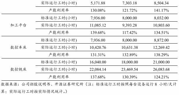 2022-2024年度,公司产能操纵率饱和,一直维持正在100%以上。大鹏工业出产的公用智能配备系非标定制化产物,每台设备原材料耗用量和出产时间均分歧,无法精确用台数暗示产能,故采用环节设备工时进行产能阐发。配备出产能力的次要环节为切割、焊接和机加工,利用的次要设备为激光切割机、加工平台、数控车床、数控铣床,产能添加次要依赖于添加上述设备及功课人员。