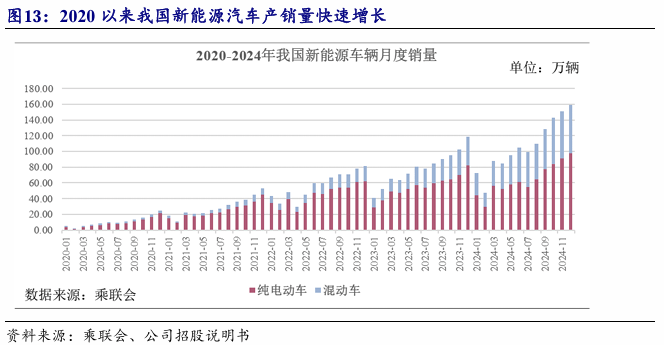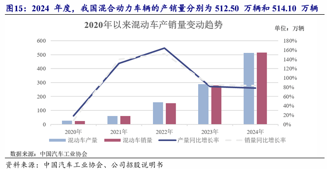 2023年以来,跟着手艺的快速迭代及动力电池成本的降低,插电夹杂动力车辆因能无效均衡行驶里程、燃油经济性、动力机能和发卖价钱等需求,已逐步取得市场消费者承认。2024年度,我国夹杂动力车辆的产销量别离为512。50万辆和514。10万辆,较2023年的287。70万辆和280。40万辆别离增加78。14%和83。35%,已接近新能源车产销量的40%。按照《节能取新能源汽车手艺线》,我国至2035年将逐渐裁减保守内燃机车辆,纯电动汽车取插电夹杂动力汽车将各占销量一半。因而,正在将来一段时间,插电夹杂动力车辆将成为带动新能源车辆增加的次要力量。新能源汽车的成长打破了我国以合伙品牌为从导的保守市场款式。据乘联会统计。