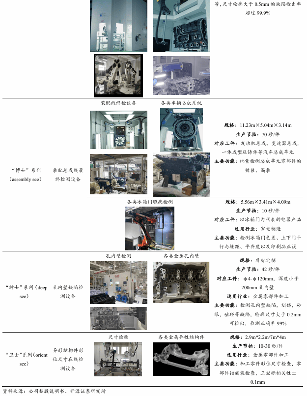 AOI检测)、精测电子(面板检测)、天准科技(计量影像设备)、荣旗科技(苹果无线充电模组检测设备)等企业。公司属于视觉配备范畴,次要针对汽车行业大型零部件质量检测,包罗汽车零部件概况缺陷检测、孔内壁检测、布局件空间丈量、总成拆卸检测、漆面检测,以及汽车出产线视觉算法平台等。对于汽车行业机械视觉市场,目前尚无占领地位的企业,贫乏成熟的使用案例和缺陷检测的通行尺度,尚处于市场起步阶段的窗口期。公司正在此市场已堆集四年以上经验和必然的使用案例,有自从研发软硬件根本设备和公用视觉算法的能力,处于较好的合作。例如:公司异形空间布局件的型位检测范畴的产物手艺机能已取进口厂商。