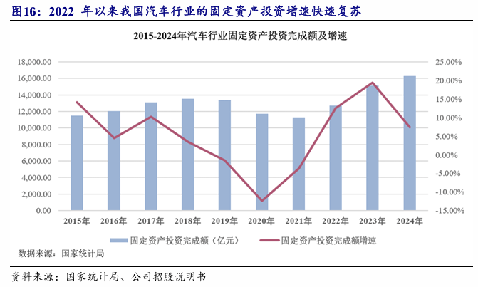 2017年达到前一阶段峰值。2018-2020年,受宏不雅经济放缓及外部影响,我国汽车产销量持续三年呈现下滑;2020年度,我国汽车产量、销量别离为2017年峰值的87。31%和86。58%。2021年以来,我国汽车行业快速苏醒;2024年度,我国汽车产销量别离为3,128。20万辆和3,143。60万辆,达到汗青新高。此外,我国目前人均具有车数量仍远掉队于发财国度,仍有较大增加潜力。据统计,2024年我国千人汽车具有量为249辆,而排名第一的美国为868辆,、英国、法国等发财国度均超500辆,我国取发财国度之间仍无数倍差距。综上,跟着我国宏不雅经济企稳回升,我国汽车财产链压力将逐渐缓解、汽车消费需求将进一步,我国汽车行业将苏醒,进而带动汽车制制及配套行业逐渐回暖。
