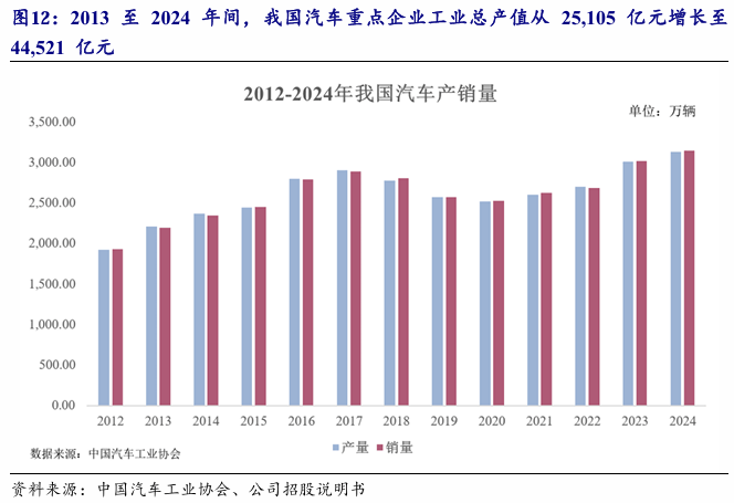 2013至2024年间,我国汽车沉点企业工业总产值从25,105亿元增加至44,521亿元,汽车工业成长敏捷,已持续多年成为全球第一大汽车产销国。