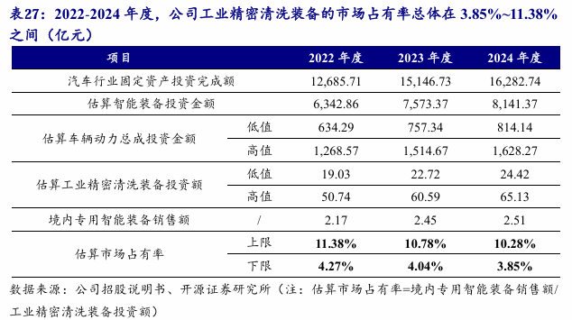 以上。据行业客户,车辆动力总成的设备投入占总设备投入的10%-20%摆布,工业细密清洗配备又占动力总成产线%之间。据此估算工业细密清洗配备市场规模及刊行人产物市场拥有率环境,2022-2024年度,公司工业细密清洗配备的市场拥有率总体正在3。85%~11。38%之间,中位值约为7%,市场成长潜力较大。3。4。