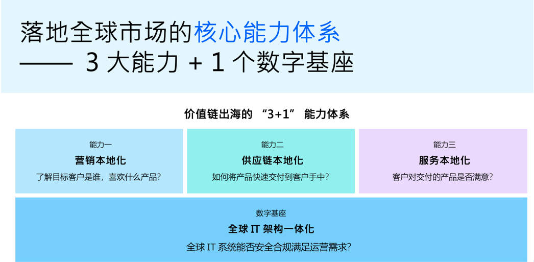 具体来看。起首,IBM认为中国平易近营企业智能化全球化需要建立全球市场焦点能力系统,即“3大能力+1个底座”。3大能力即营销当地化、供应链当地化和办事当地化,也就是正在全球各地市场建立本地的营销、供应链和办事,而3大能力需要基于一个全球IT架构一体化的数字基座,而这个数字基座是全球规模的开源企业级夹杂云,前面曾经谈到IBM正正在这方面加大投资,推进夹杂云能力的飞跃。而因为是基于业界尺度化的开源手艺,所有的手艺投资都能“插回”数字基座并互操做性。